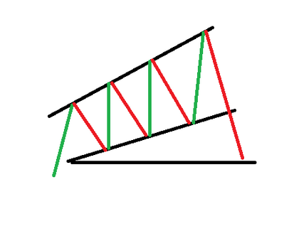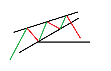 En este patrón, el precio sigue aumentando, aunque de forma cada vez más lenta. Los mínimos se acercan cada vez más a los máximos hasta que se produce una corrección que rompe con la línea de soporte.