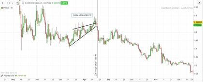 BTC/USD y soporte en V Elevamos el rango del gráfico a un día en ADA/USD y encontramos una cuña ascendente.