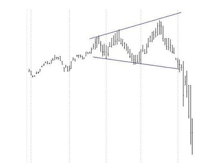 En este patrón, el precio se mueve dentro del rango delimitado por una directriz inferior horizontal y una directriz superior bajista, haciendo que los máximos sean decrecientes y los mínimos laterales.