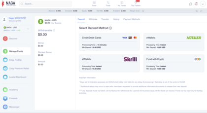 - Depósito de fondos: NAGA permite realizar depósitos mediante tarjetas de crédito/débito, transferencias bancarias, monederos electrónicos y criptomonedas. El depósito mínimo varía según la cuenta y el país.