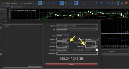 Ejemplo práctico: si Apple rompe un soporte y quieres operar a la baja (venta en corto), puedes poner: