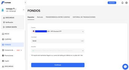 3. Elige la cuenta de trading donde quieres recibir el dinero. Si tienes algún cupón es momento de insertarlo. Luego, en la misma ventana, ingresa el monto a depositar. Eliges la cuenta y monto.