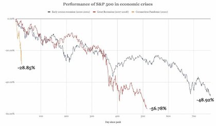 Para comprender mejor estas caídas y su magnitud, basta observar el gráfico comparativo, aunque en este caso sea del S&P 500. Este gráfico muestra cómo la caída bursátil se compara con la crisis del 2008 y el pinchazo de la burbuja puntocom.