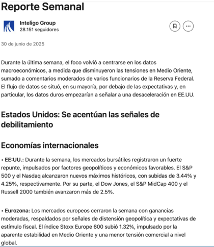 Al igual que Coril, utiliza sus redes sociales, en este caso su newsletter de “Reporte Semanal” con análisis macroeconómicos para orientar al usuario.