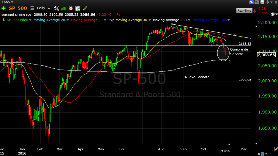 La situación del mercado luce como muy precaria, por lo que podríamos continuar viendo una tendencia a la baja en los siguientes días o semanas. En el corto plazo, el mercado va a encontrar un soporte relativo alrededor de los 2,074 puntos, aunque un mayor soporte recién lo veríamos muy cerca a los 2,000 puntos.