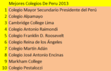La Tulipe Noire En esta ocasión les traigo el ranking de los mejores colegios del Perú. De estos colegios mencionados, solo Colegio Mayor Secundario Presidente del Perú es el único publico del ranking.
